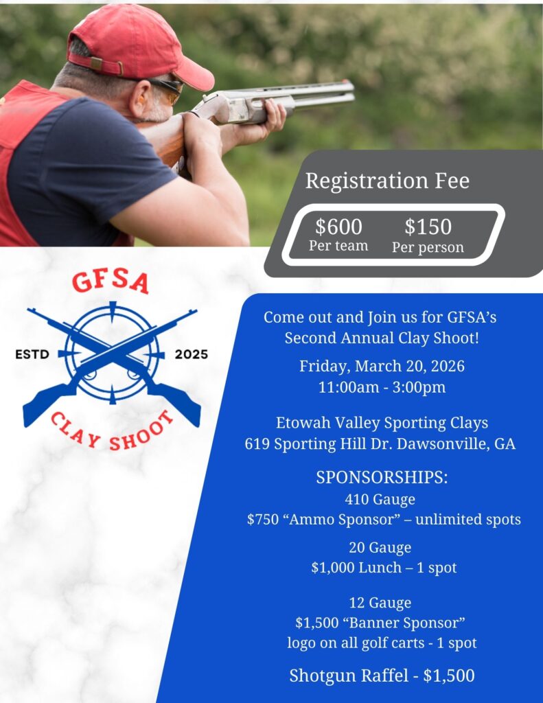 2026 2nd Annual Clay Shoot Date: March 20, 2026 11:00 am Etowah Valley Sporting Clays: 619 Sporting Hill Drive Dawsonville, GA Registration Name(Required) First Last Company(Required)PhoneEmail(Required) TEAM REGISTRATION Quantity(Required) Price: $600.00 Quantity INDIVIDUAL REGISTRATION Quantity(Required) Price: $150.00 Quantity 410 Gauge Sponsor Quantity(Required) Price: $750.00 Quantity Shotgun Raffel - SOLD OUT20 Guage Sponsor - SOLD OUT12 Guage Sponsor - SOLD OUTCredit Card UntitledUntitled